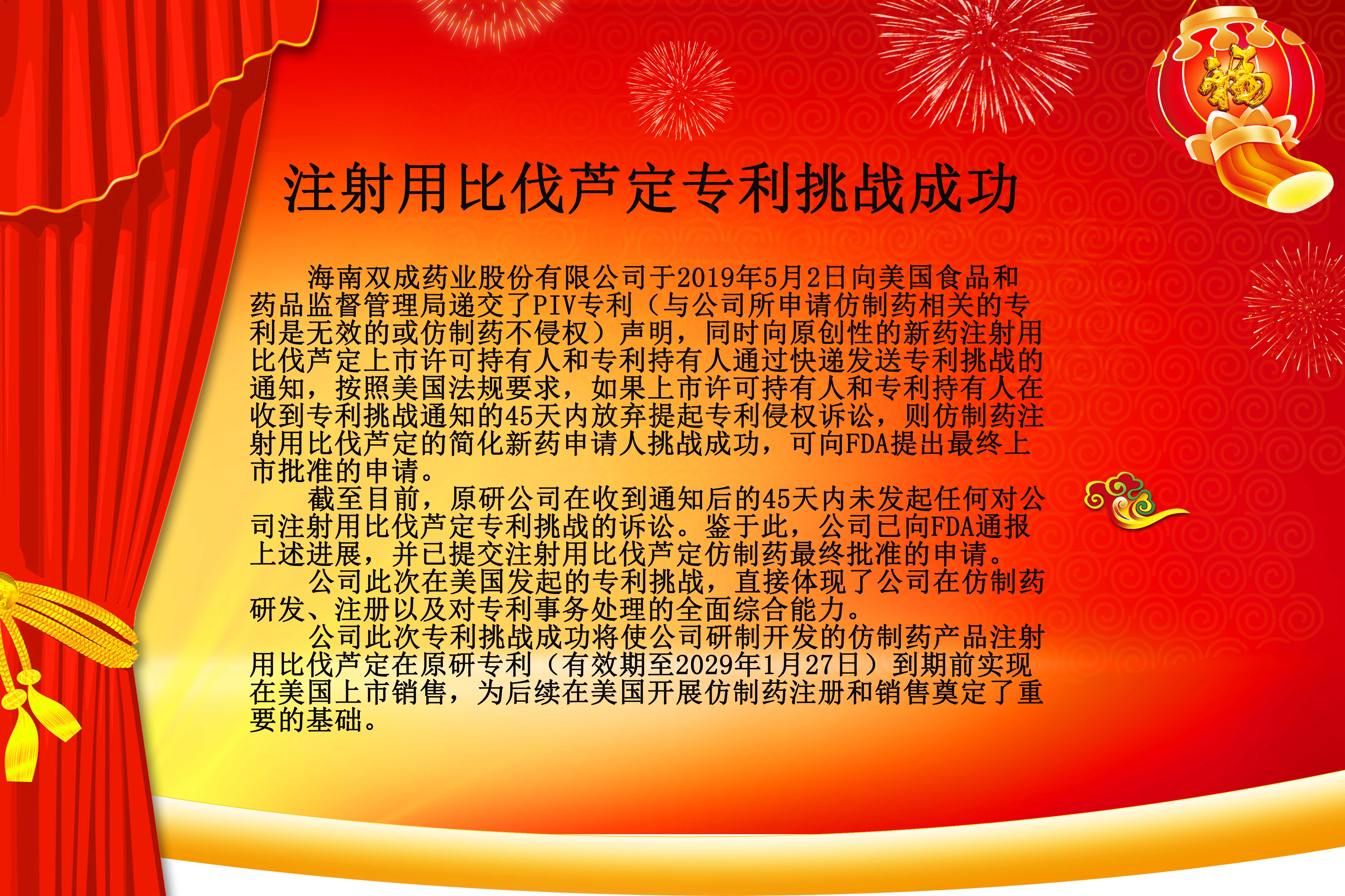 海南双成药业股份有限公司于2019年5月2日向美国食品和药品监督管理局递交了PIV专利(与公司所申请仿制药相关的专利是无效的或仿制药不侵权)声明,同时向原创性的新药注射用比伐芦定上市许可持有人和专利持有人通过快递发送专利挑战的通知,按照美国法规要求,如果上市许可持有人和专利持有人在收到专利挑战通知的45天内放弃提起专利侵权诉讼,则仿制药注射用比伐芦定的简化新药申请人挑战成功,可向FDA提出最终上市批准的申请。